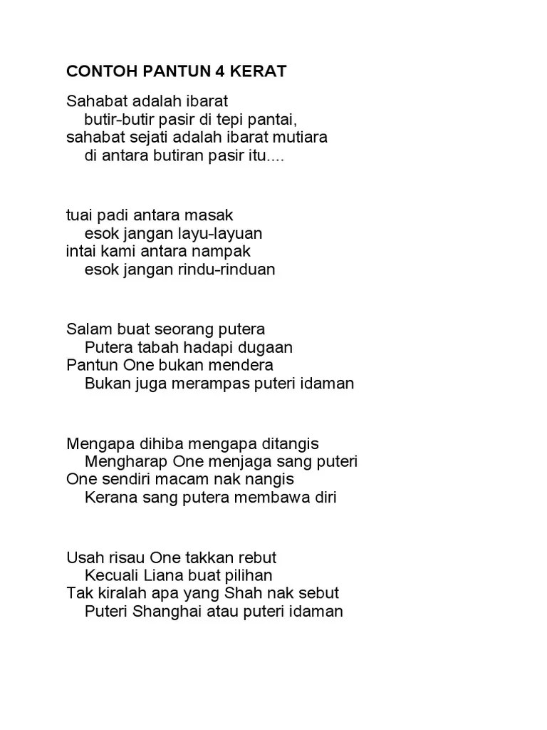 Pantun 4 Kerat Hormat Menghormati : Pesanan Tok Ayah Pantun Empat Kerat. Siang hari mencari mutiara, maruah diri patut dipelihara. Definisi seni perkataan seni dapat ditakrifkan sebagai sesuatu yang halus iaitu kecil, elok, tipis dan halus, enak didengar iaitu mengenai suara, comel bentuk badan (kamus dewan, 2005). Dayung sampan ke pulau angsa, pakai sopan setiap masa.